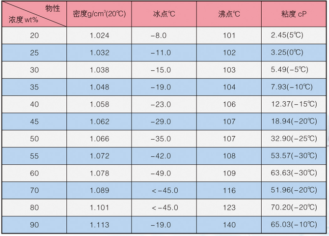 LM-4系列冰河冷媒由二元醇改性構(gòu)成,主要添加劑包括防腐蝕劑,防霉劑,增溶劑,水穩(wěn)劑等。外觀為淺色液體。安全低毒、無異味、不易燃、不易揮發(fā)。20℃時,原液密度為1.105~1.125g/cm',粘度為13.92mPa·s(cP),比熱為0.619cal/g℃,熱導率為0.26W/mK。沸點高于140℃,閃點高于120℃。