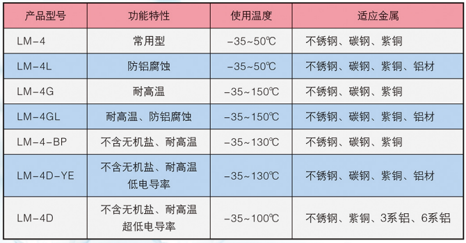 LM-4系列冰河冷媒具有低毒,不易燃,比熱大,安全穩(wěn)定,載冷能力強等優(yōu)點。對碳鋼、不銹鋼、紫銅等金屬防銹性能優(yōu)良。在不同濃度條件下,可以在很寬的溫度范圍內(nèi),廣泛應用于各種制冷系統(tǒng)。使用時,根據(jù)具體工藝溫度要求單獨使用或用水稀釋成適當濃度后應用。如與醇類載冷劑混合使用,應加入適量的冰河冷媒增效劑。其中:
